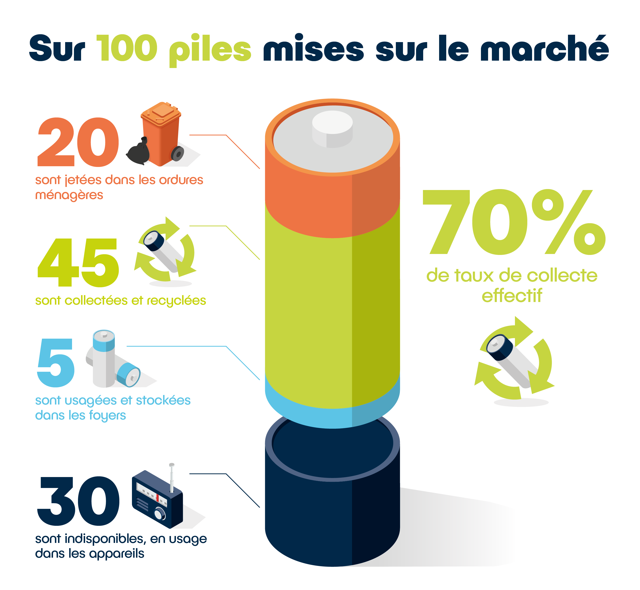 - Jusqu’à 80 % des métaux contenus dans les piles et petites batteries sont extraits et réutilisés dans l’industrie.