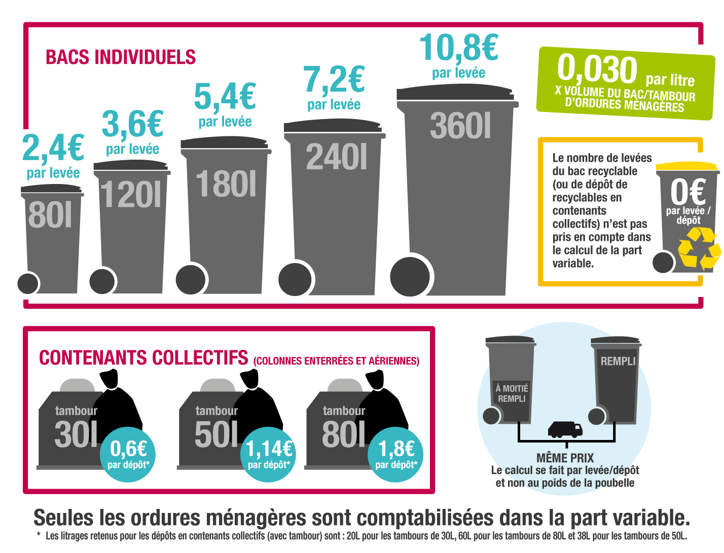 - Comprend une part incitative, calculée en fonction de l’utilisation réelle du service : moins je produis d’Ordures Ménagères, plus cette part incitative est faible ;